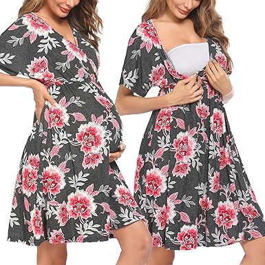 Amazon Com Hotouch Vestido De Maternidad De Manga Corta Para Mujer Estilo Casual Floral Largo Hasta La Rodilla Ropa De Embarazo Para Baby Shower Clothing
