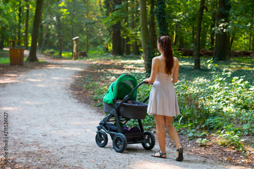 Back View Of Woman In Beautiful Summer Dress Holding The Pram With Her Happy Cute Baby Inside Mother With The Infant Walking With The Pram Outside Stock Photo Alamy